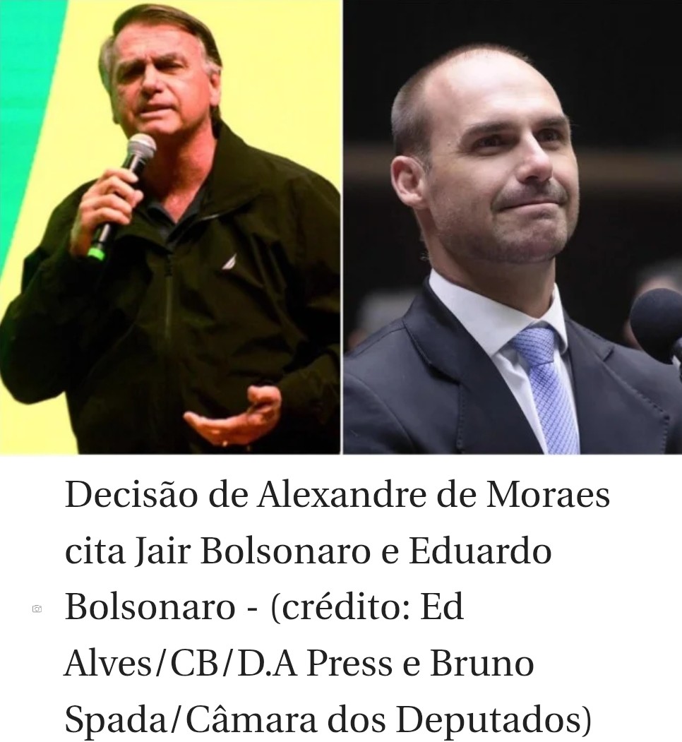 - A Polícia Federal indicou a necessidade de coletar "elementos contemporâneos aos fatos apurados" que pudessem reforçar o elo subjetivo e a atuação conjunta entre Eduardo e Jair Bolsonaro.