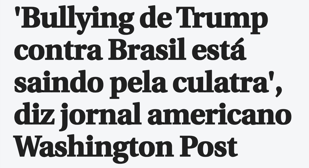 Um artigo do jornal americano The Washington Post publicado no domingo (21/07) afirma que o "bullying praticado por [Donald] Trump contra o Brasil está saindo pela culatra" — em referência ao anúncio de tarifas de 50% contra produtos brasileiros nos Estados Unidos feito em protesto contra o julgamento de Jair Bolsonaro no Supremo Tribunal Federal brasileiro.