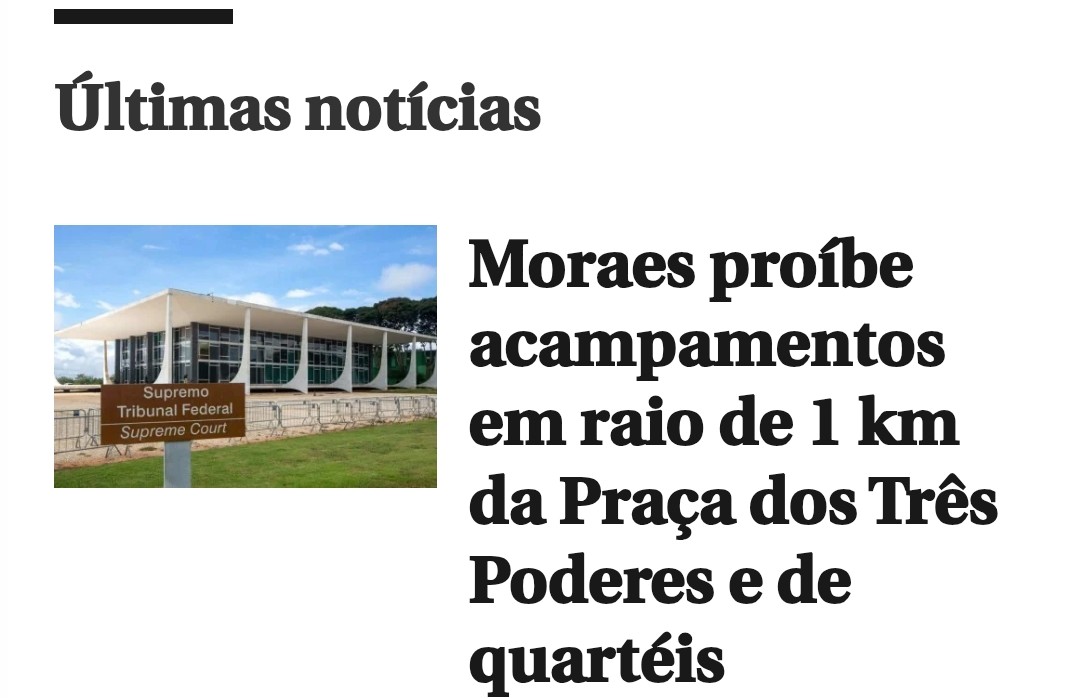 “Determino a proibição de qualquer acampamento em um raio de 1km da Praça dos Três Poderes, Esplanada dos Ministérios e, obviamente, em frente aos quartéis das Forças Armadas”, diz a decisão.