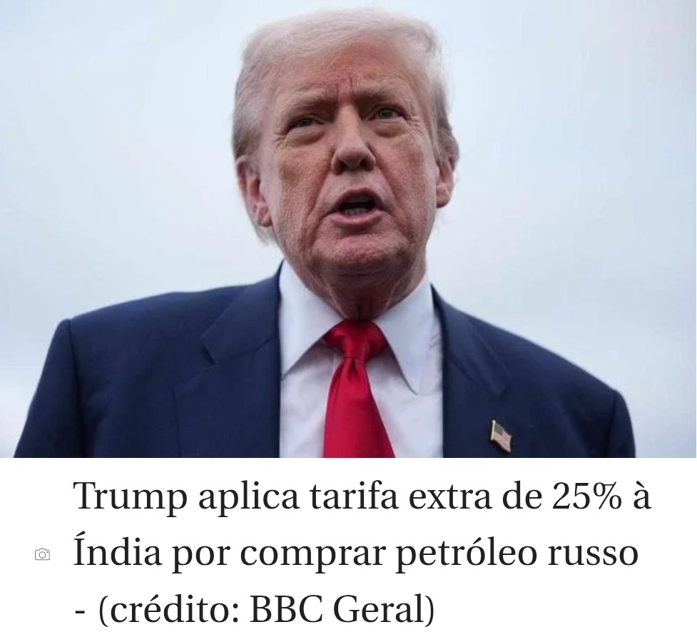 Anteriormente, o presidente americano já havia alertado que aumentaria as tarifas, afirmando que a Índia "não se importa com quantas pessoas estão sendo mortas na Ucrânia pela máquina de guerra russa".