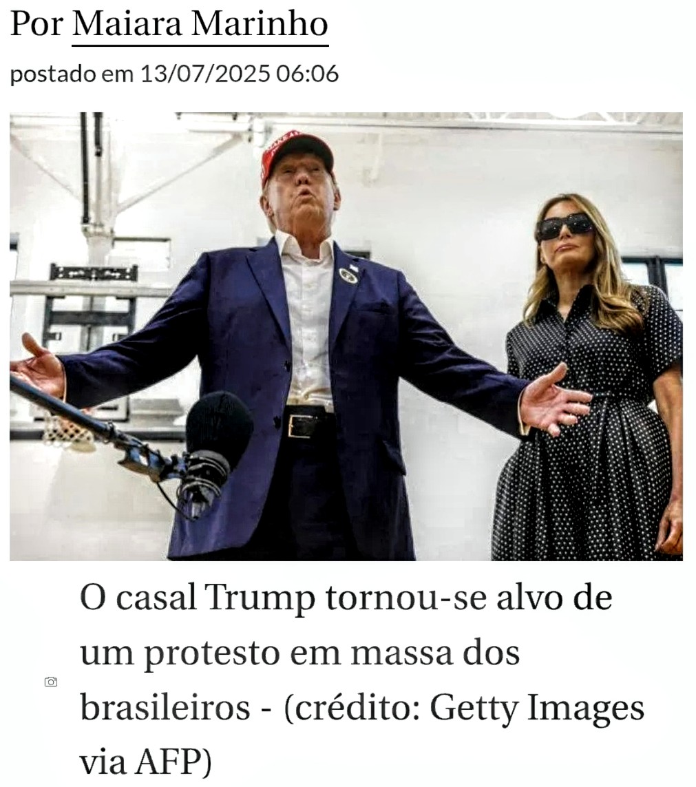A imposição de uma tarifa de 50% sobre produtos anunciada por Donald Trump, presidente dos Estados Unidos, desencadeou uma onda de protestos virtuais liderada por brasileiros nas redes sociais do presidente norte-americano e da mulher, Melania Trump.