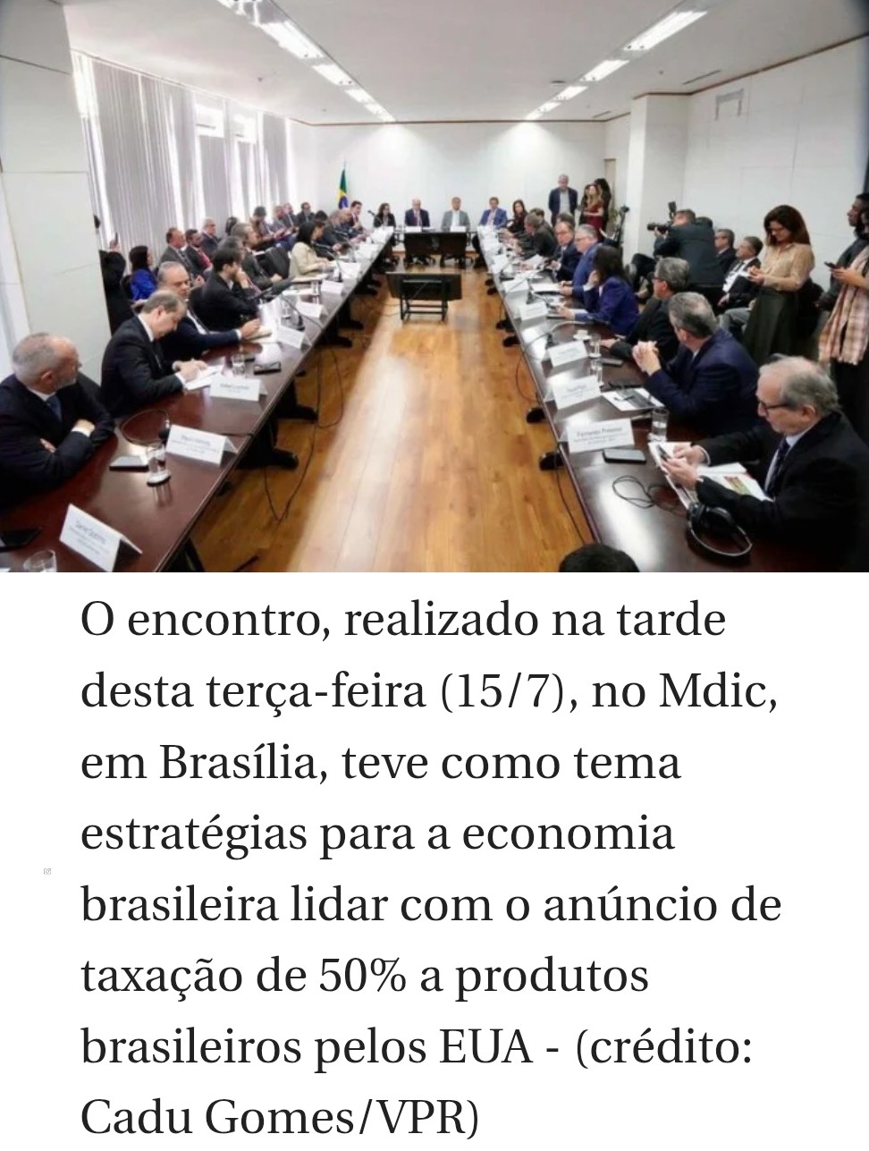 O encontro, realizado na tarde desta terça-feira (15/7), no Mdic, em Brasília, teve como tema estratégias para a economia brasileira lidar com o anúncio de taxação de 50% a produtos brasileiros, feito na semana passada pelo presidente Donald Trump.