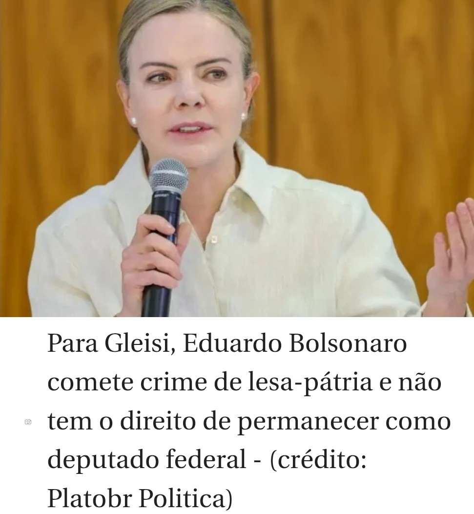 A ministra da Secretaria de Relações Institucionais (SRI), Gleisi Hoffmann, declarou nesta terça-feira (29/7) que o deputado federal licenciado Eduardo Bolsonaro (PL-SP) “não tem o direito de continuar deputado”, e disse esperar que a Câmara casse o seu mandato.
