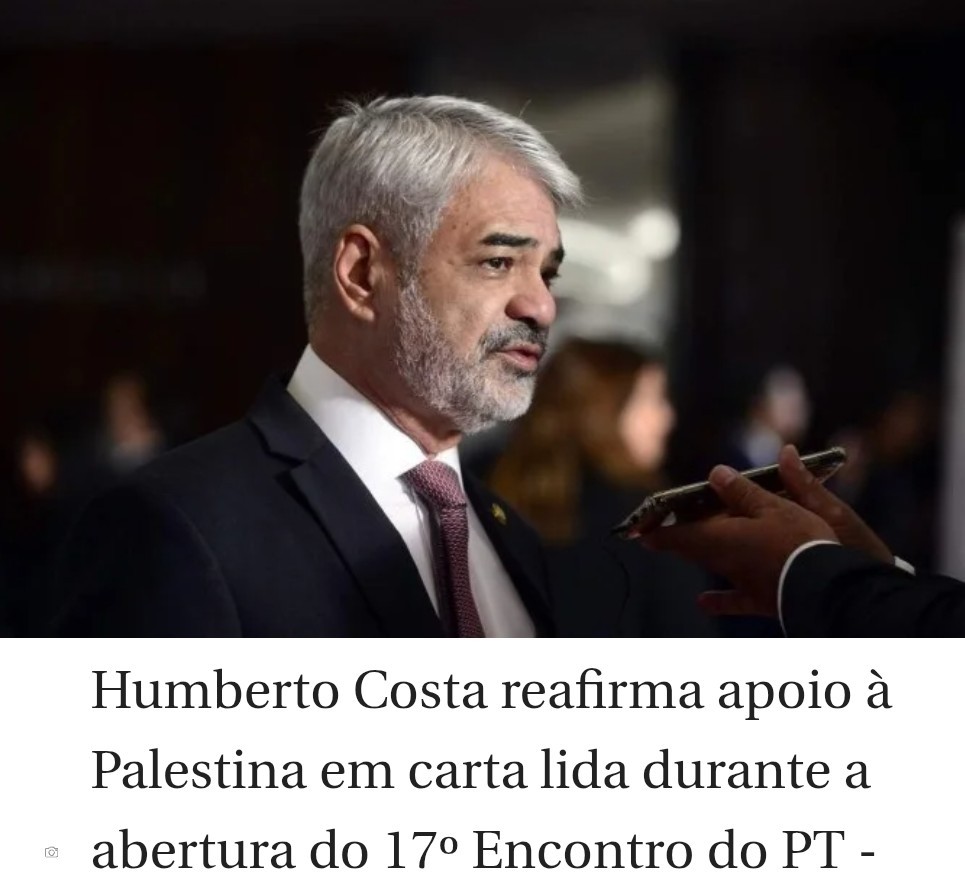 Na abertura do 17º Encontro do PT, na noite desta sexta-feira, em Brasília, o senador e atual presidente nacional do PT, Humberto Costa, leu a carta de apoio ao povo palestino e reafirmou a posição histórica do PT em defesa da causa.