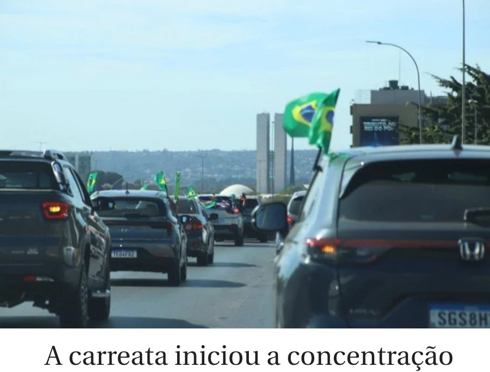 A carreata bolsonarista iniciou a concentração na Torre de TV às 8h30 e fará trajeto pelo Eixo Monumental até o condomínio Solar de Brasília, onde o ex-presidente Jair Bolsonaro (PL-RJ) encontra-se em prisão domiciliar.